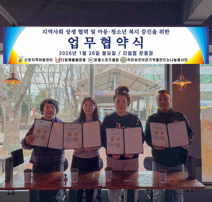 [코리아피플뉴스/김종성기자]광주광역시 북구 문흥동에 소재한 신원지역아동센터(센터장 정진숙), 다함께돌봄센터문흥(센터장 김지유), 문흥스포츠클럽(대표 김종성), 작은씨앗이 큰 기적을 만드는 나눔 봉사단(대표 이주영)은 26일 리얼펍(문흥점)에서 지역사회 상생 협력 및 아동·청소년 복지 증진을 위한 업무협약(MOU)을 체결 했다고 밝혔다.