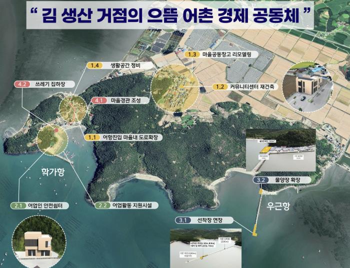주요사업은 ▶생활기반시설 확충(마을내 도로확장, 커뮤니티센터 재건축) ▶안전관리 (어업인 안전쉼터, 교통 안전시스템 구축) ▶어항정비 (선착장 연장, 물양장 확장) ▶청정환경 마을경관조성(쓰레기 집하장) ▶주민역량 강화 등이 추진된다.