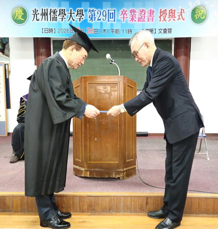 이어진 축사에서 기호석 전교는 광주향교의 유래를 소개하며 “임진왜란 당시 많은 의병장을 배출한 충의의 고장 광주향교의 전통을 이어가길 바란다”고 강조했다. 정영균 회장 또한 축사를 통해 졸업생들의 노고를 치하하며 유림으로서의 책임과 역할을 당부했다.