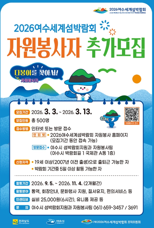 여수시, 2026여수세계섬박람회 자원봉사자 “다봉이” 추가 모집