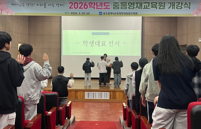 광주시교육청창의융합교육원은 20일 본원 대강당에서 열린 ‘2026학년도 중등영재교육원 개강식’에서 참여 중학생 203명이 개강선서를 하고 있다.