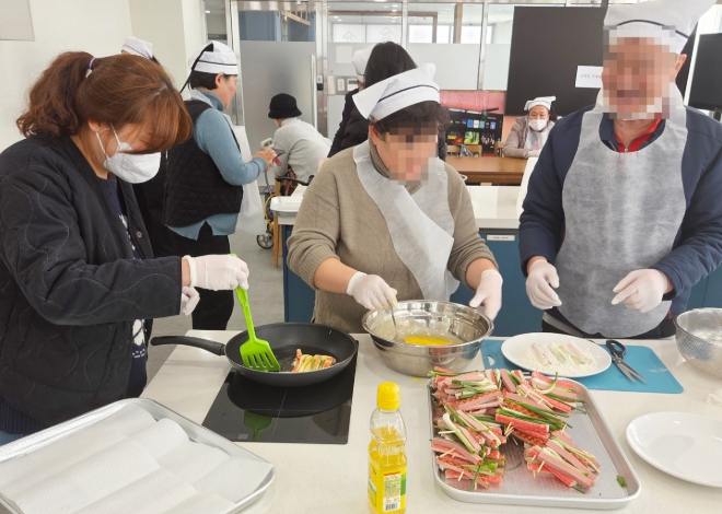 광산구 ‘1313 이웃살핌’에 이웃지기, 살핌이웃으로 함께 요리 수업 자조모임에 참여한 주민들이 요리를 배우고 있다.