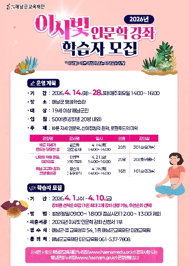 [코리아피플뉴스]해남군교육재단은 4월 14일부터 28일까지‘해남 이사빛 인문학 강좌’를 운영한다.‘이사빛’은‘이른 아침 따스하게 비추는 햇빛’을 의미하며 따뜻하고 친근한 인문학의 빛을 전하는 군민 교육과정이다.