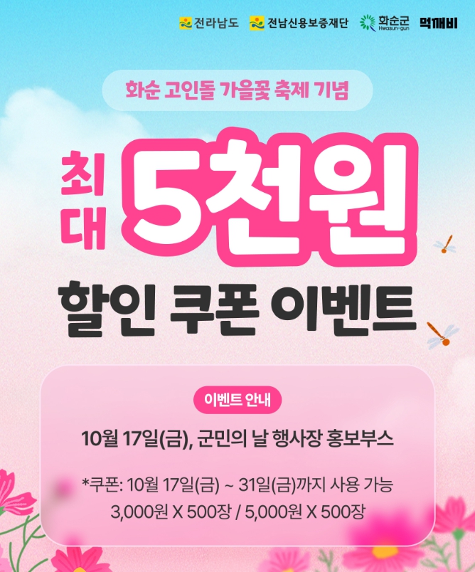 [코리아피플뉴스]화순군은 오는 10월 17일 제44회 화순군민의 날 행사장에서 2025 화순 고인돌 가을꽃 축제 기념 공공배달앱 ‘먹깨비’ 이벤트를 진행한다고 밝혔다.